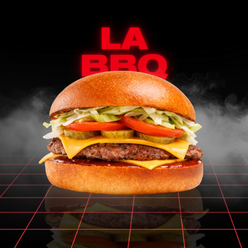 Double smash burger with double cheddar cheese, pickles, lettuce, tomato slice, caramelized onions, and homemade BBQ sauce.