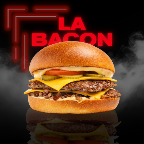 Double smash burger with double cheddar cheese, pickles, crispy bacon, tomato slice, and LA SUCULENTA special sauce.