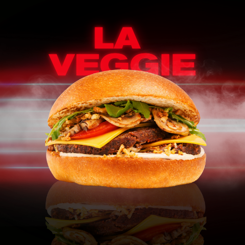 Tofu and mushroom burger, cheddar cheese, arugula, tomato slice, pickle, caramelized and crispy onion, veggie sauce made with mayonnaise and La Vera paprika.