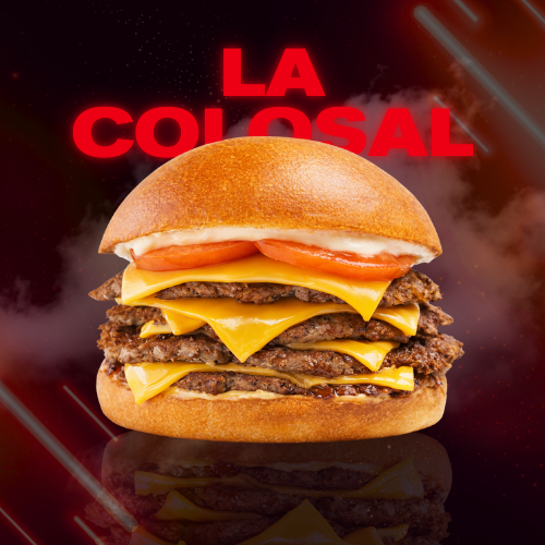 4 smash burgers + 4 cheddar cheese + 2 tomatoes + caramelized onions + pickles + crispy bacon + COLOSAL Premium sauce