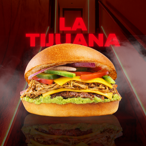 Grilled pulled pork, smash burger with double cheddar cheese, guacamole, lime, red onion, bell pepper, jalapeño, tomato slice, and Tijuana sauce.